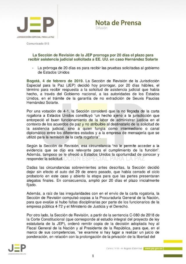 "La Sección de Revisión de la Jurisdicción Especial para la Paz (JEP) decidió prorrogar, por 20 días hábiles, el término para recibir respuesta a la solicitud de asistencia judicial que había pedido, a través de Gobierno Nacional, a las autoridades de Estados Unidos, en el trámite de la garantía de no extradición de Seuxis Paucías Hernández Solarte, 'Jesús Santrich'", indicó la JEP en un comunicado.