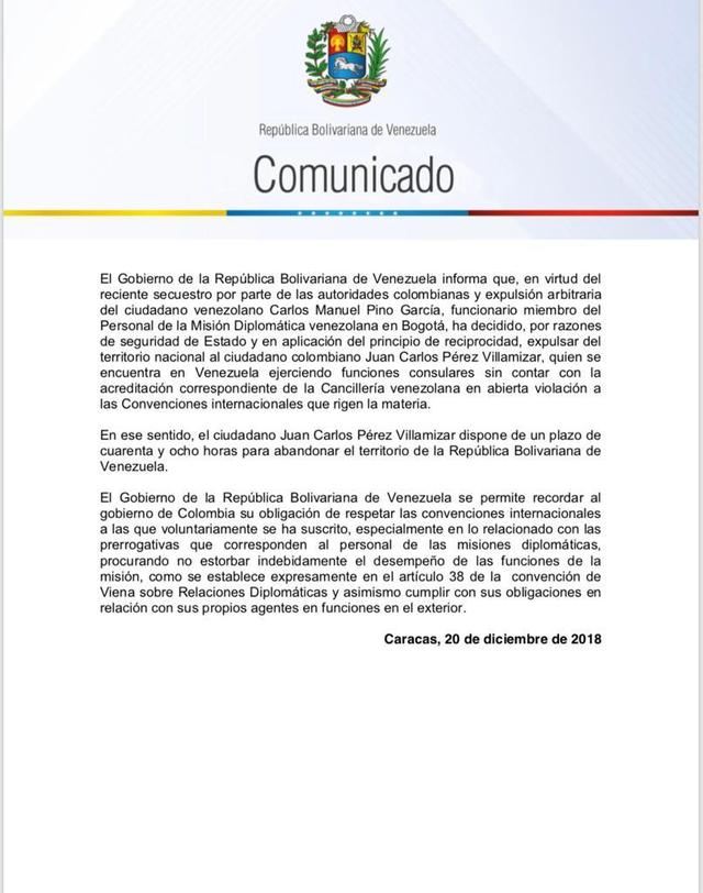 "Ante la arbitraria medida de secuestro y expulsión por parte de las autoridades colombianas del ciudadano venezolano Carlos Pino, funcionario de nuestra embajada en Bogotá, anunciamos la expulsión de Juan Carlos Pérez Villamizar, funcionario consular colombiano no acreditado", ha escrito el canciller venezolano, Jorge Arreaza, en su cuenta de Twitter.