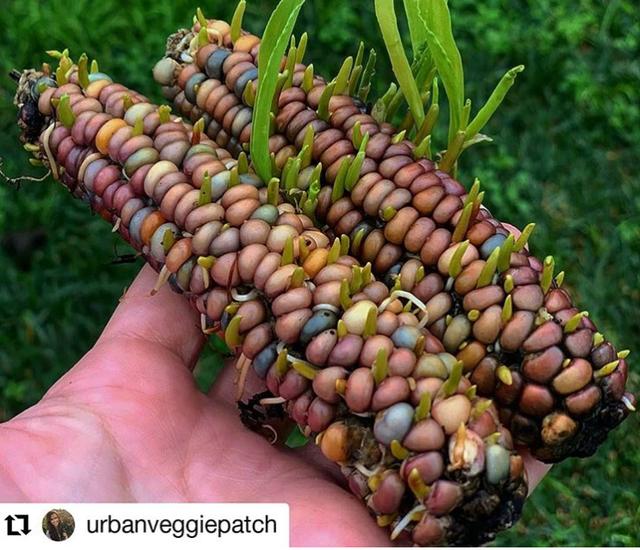 グラスジェムコーンと呼ばれるカラフルなとうもろこしの発芽。穀類が20%以下の水分にまで乾燥し、その後の雨で水分が回復した場合に最も起こりやすいそうだ。