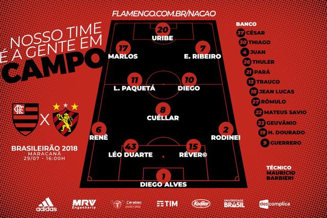 Titulares: Diego Alves, Rodinei, Léo Duarte, Réver e Renê; Cuéllar, Lucas Paquetá e Diego; Everton Ribeiro, Marlos e Uribe.
