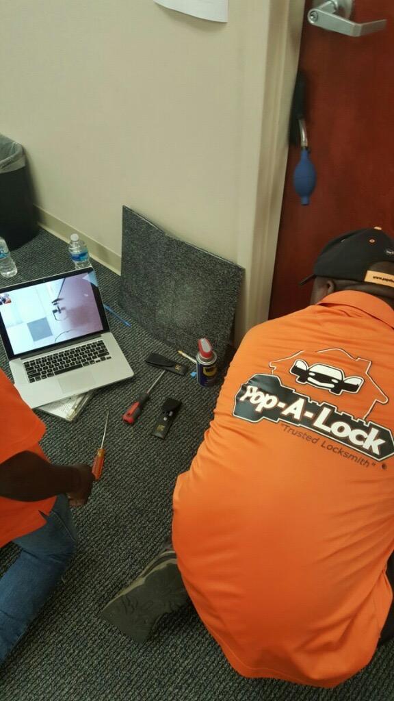 Because of this, the locksmith was able to use a flexible reach tool to pull the door handle down to open it. And just like that, he has access to his office again.