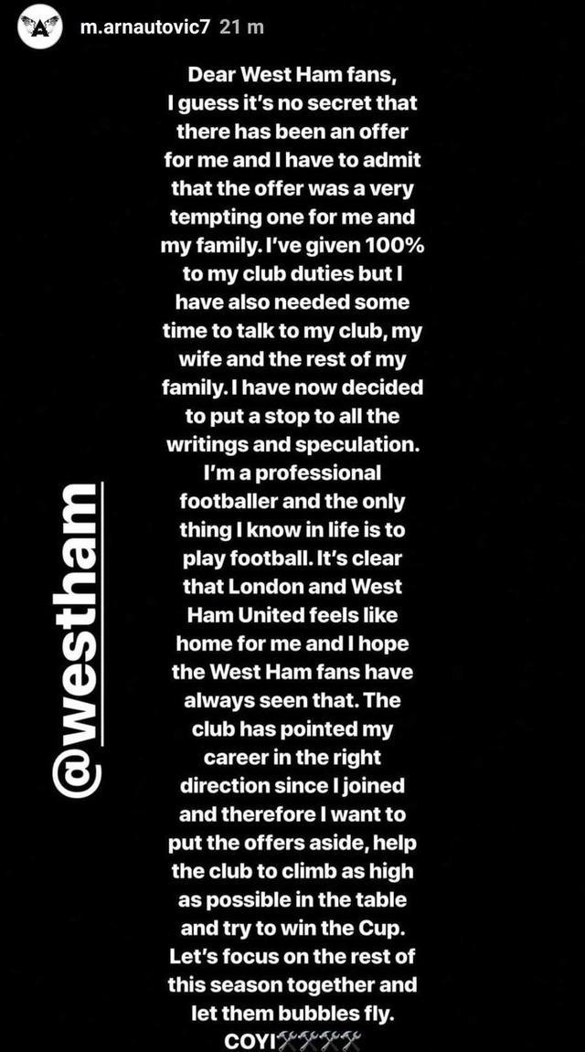 Writing on his official Instagram story, Arnautovic said: "Dear West Ham fans, I guess it's no secret that there has been an offer for me and I have to admit that the offer was a very tempting one for me and my family.