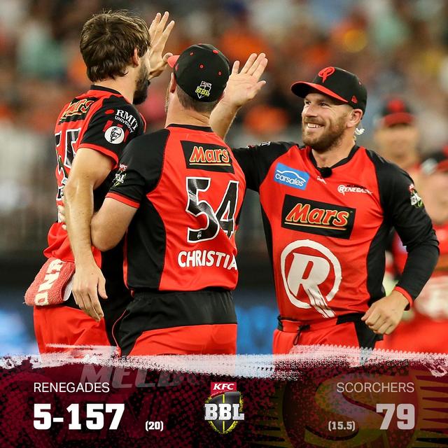 Perth Scorchers will miss out on the Big Bash League semi-finals for the first time in their history after being dismissed for just 79 in Melbourne Renegades' dominant 78-run victory.