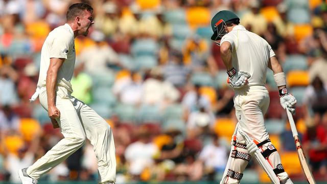 Ball claimed the scalp of David Warner (26) as Australia slumped to 76-4 in reply to 302, before Steve Smith (64 not out) and Shaun Marsh (44no) frustrated the tourists on another day of attrition in Brisbane.