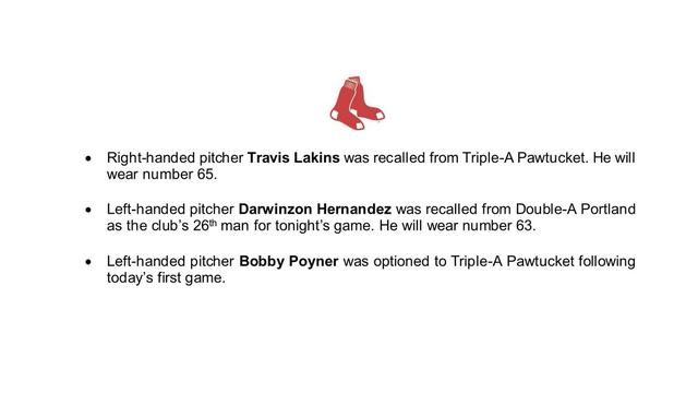 Well, we missed a move between games on Tuesday. Darwinzon Hernandez was, of course, called up to the major-league roster to serve as the 26th man on the active roster for the second game of Tuesday’s doubleheader. In addition to that, the Red Sox optioned lefty Bobby Poyner back to Pawtucket and called up Travis Lakins to make his major-league debut.