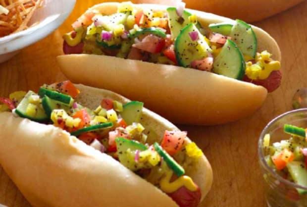 3. Place the buns on a serving platter. Place a hot dog on each bun with 2 tablespoons of the tomato mixture, and relish and mustard to taste.