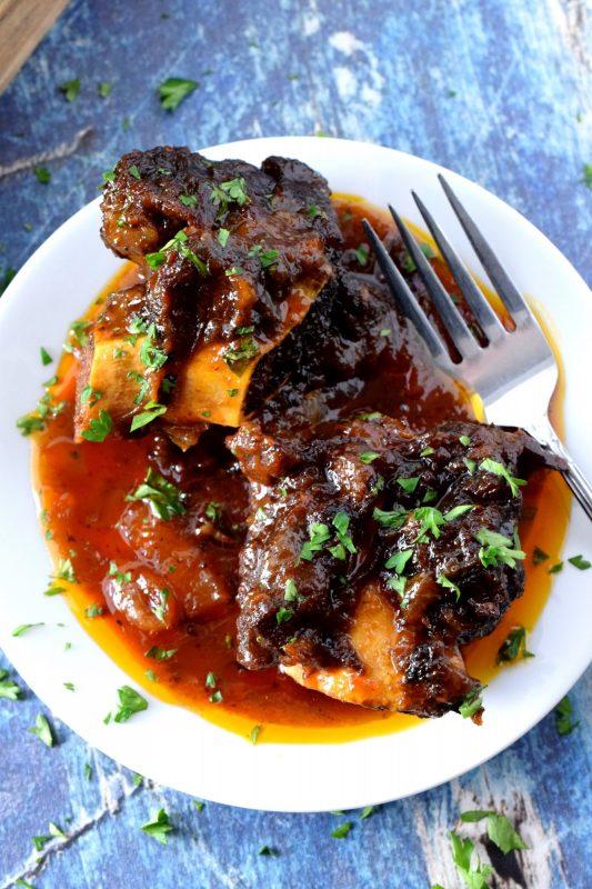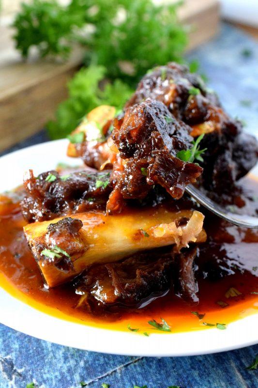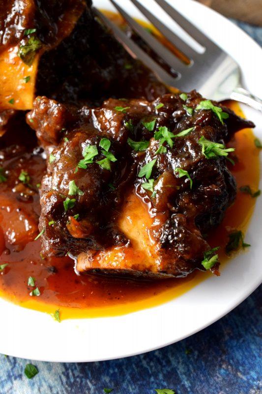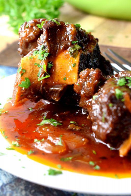 Pile the cooked short ribs back into the pot. Pour the sauce mixture over top. Move the short ribs around so that they are covered by the sauce as much as possible. Place a lid on the pot and bake for two hours, checking and gently stirring every 30 minutes.