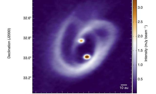 "We see two compact sources, that we interpret as circumstellar disks around the two young stars," explains Felipe Alves from MPE, who led the study. "The size of each of these disks is similar to the asteroid belt in our Solar System, and their mutual distance is about 28 times the distance between the Earth and the Sun." Both protostars are surrounded by a circumbinary disk with a total mass of about 80 Jupiter masses, which shows a complex network of dust structures distributed in spiral shapes. The shape of the filaments suggest streamers of in-falling material, which is confirmed by the observation of molecular emission lines.