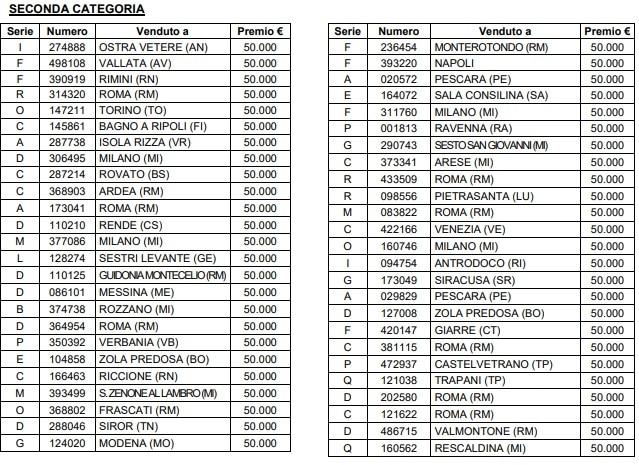 Contestualmente all'estrazione dei premi di prima categoria somenica 6 gennaio 2019 sono stati estratti i codici dei biglietti vincenti dei premi di seconda categoria: su questa pagina dedicata ai premi di seconda categoria si possono scoprire tutti i codici.