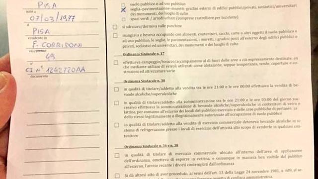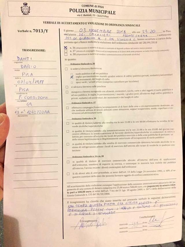 Si è seduto intorno alle 23 di sabato, 3 novembre, sui gradini della Chiesa di Santo Stefano dei Cavalieri in piazza dei Cavalieri, cuore della movida pisana, e ha 'beccato' una bella multa, con tanto di verbale pubblicato sulla sua pagina Facebook. A lanciare la provocazione, che gli è costata 100 euro in ottemperanza all'ordinanza antidegrado lanciata un mese fa dalla Giunta del sindaco Conti, è l'ex assessore Dario Danti che per sbeffeggiare un'ordinanza che trova ingiusta ha fatto scrivere dai vigili urbani intervenuti in fondo al verbale: "Un tempo questa piazza era vissuta, adesso è pericolosa perchè con l'acqua e sapone è pericoloso e si rischia di scivolare".
