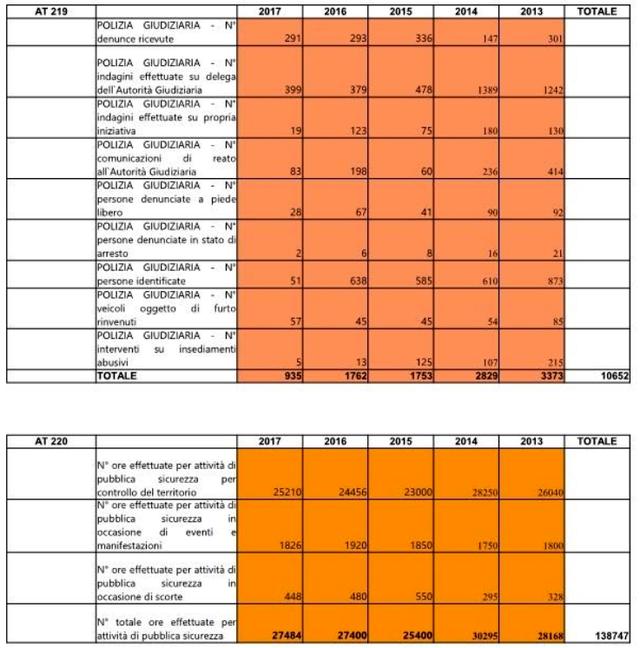 Il Comandante mi ha risposto nel giro di pochi giorni, inviandomi 5 rapporti, suddivisi per anno dal 2013 al 2017, con il dettaglio puntuale dell'attività svolta. Vi allego i dati raggruppati delle due attività oggetto dell'interviste rilasciate: AT219 "Attività di Polizia Giudiziaria" e AT220 "Attività di Pubblica Sicurezza"