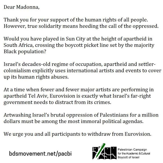 Following Madonna’s statement to Reuters, the Palestinian Campaign for the Academic and Cultural Boycott of Israel released the following response: