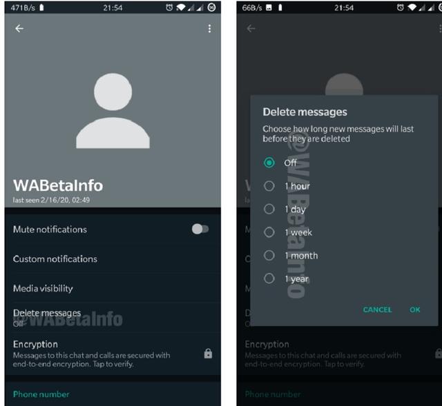 Esta función se detectó en las versiones beta versions 2.20.83 y 2.20.84. Como se puede ver, se podrá seleccionar entre una hora y un año. Al activarla aparecerá un reloj en el mensaje escrito.