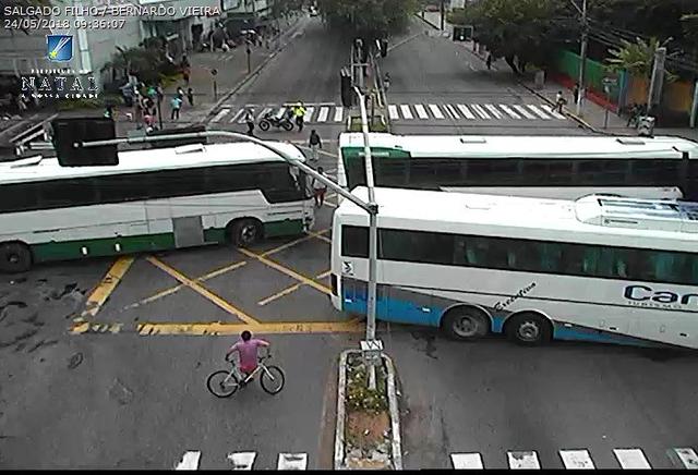 O cruzamento entre as avenidas Senador Salgado Filho e Bernardo Vieira está fechado em todos os sentidos devido protesto na manhã desta quinta-feira, 24. Motoristas de ônibus de turismo fazem a manifestação contra o aumento constante nos preços dos combustíveis.
