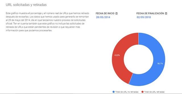 En este sentido, Google tras la citada sentencia, puso a disposición su propio formulario de retirada de contenido en su portal de transparencia en el que se muestra el número total de solicitudes recibidas y el número total de URLs cuya retirada se hubiera solicitado desde el 29 de mayo del 2014 como podemos observar en los siguientes gráficos: