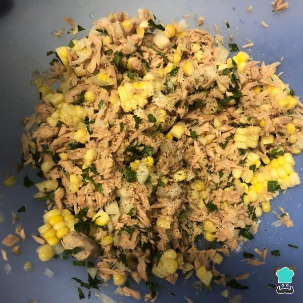 1 - Comece colocando em um bowl o atum, a cebola picada, o milho verde, a salsinha e o sal. Misture bem e reserve. Esse é o recheio desta receita de torta sem trigo.