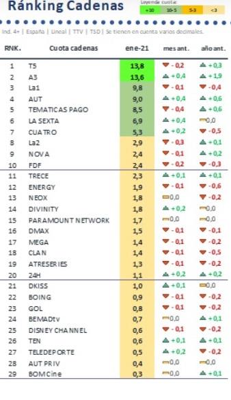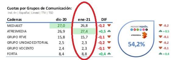 Además, Antena 3 sube cuatro décimas respecto a diciembre y 1,9 puntos respecto al mes de enero del año pasado, mientras que Telecinco se estanca perdiendo dos décimas respecto al mes pasado y ganando tres respecto al primer mes de 2020.