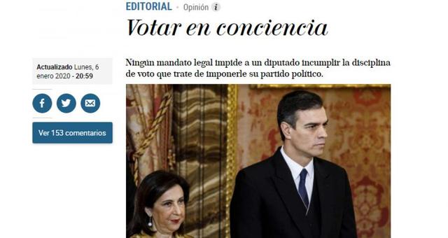 La imparcialidad del diario El Mundo ante este hecho ha quedado en entredicho después del último editorial que ha publicado el periódico que dirige Francisco Rosell bajo el titular: ‘Votar en conciencia’. En este artículo que puede leerse hoy en el diario de Unidad Editorial recuerdan que no existe un mandato legal que impida a un diputado incumplir la disciplina de voto impuesta por los partidos políticos.