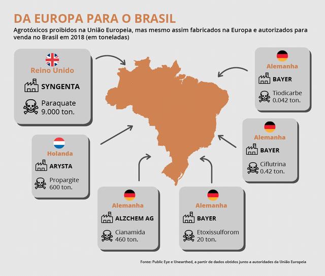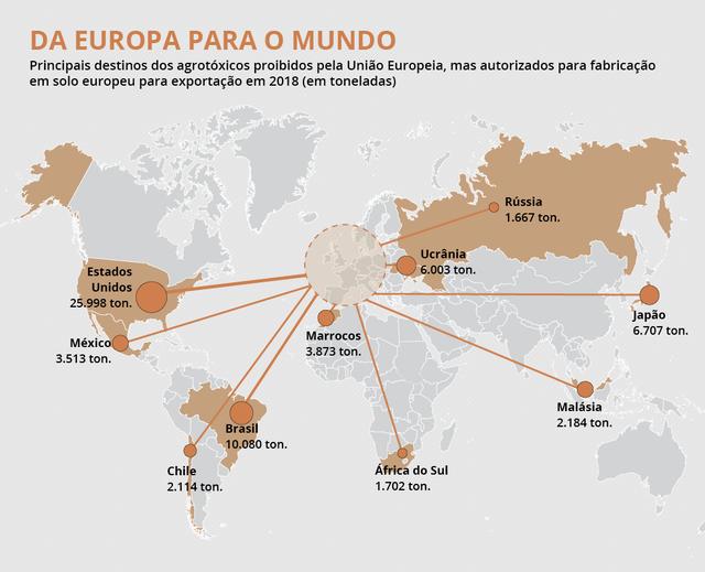 Apenas em 2018, foram mais de 81 mil toneladas autorizadas para fabricação na União Europeia e Inglaterra e venda a 85 países que não fazem parte do bloco. Os dados são de autorizações para exportação, por isso é possível que o volume efetivamente vendido seja menor.