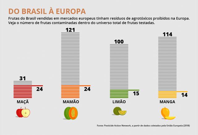 De um total de 31 amostras de maçãs que vieram do Brasil e foram testadas, 24 tinham resíduos de agrotóxicos proibidos ou de uso restrito na Europa. Quantidades significativas também foram encontradas em outras frutas, como o mamão, a manga e o limão (veja a arte).