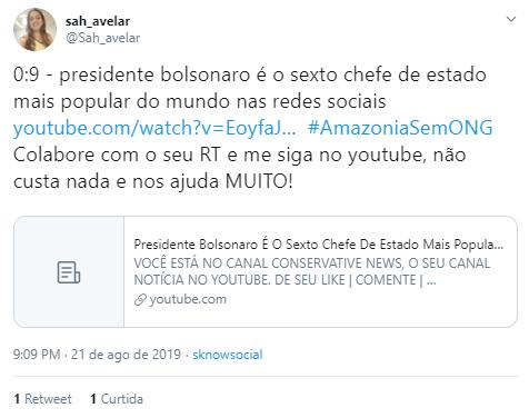 Durante as queimadas na Amazônia em meados de agosto, @Sah_avelar foi uma das mais ativas na defesa do ministro Ricardo Salles e contra organizações não governamentais. Como mostrou uma reportagem da Agência Pública, o perfil fez 417 publicações entre os dias 21 e 22 de agosto com a hashtag #AmazoniaSemONGs e 157 com a #SomosTodosRicardoSalles. Todas as postagens eram acompanhadas de um texto, muitas vezes sem vínculo com as tags, e o horário da publicação – 3 horas adiantado em relação ao fuso de Brasília.
