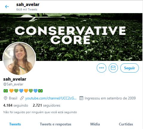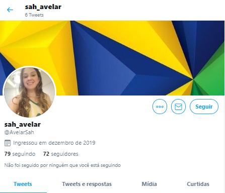 O perfil @Sah_Avelar foi criado em setembro de 2009, segue 4,2 mil contas e tem 2,7 mil seguidores. A foto de perfil era de uma jovem vestindo uma camiseta verde e amarela. A descrição se resumia a uma fileira de emojis de coração com as cores da bandeira.