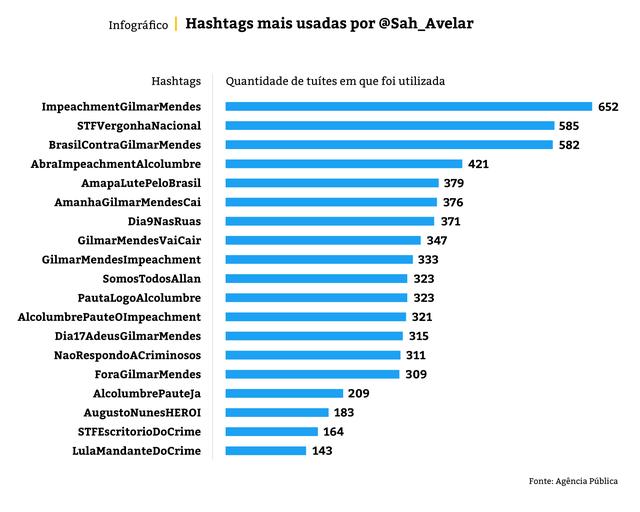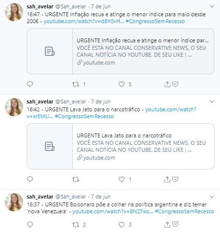 Foi só em 19 de março que a conta publicou a sua primeira tag: #BolsonaroOrgulhaOBrasil. Uma única publicação. Na época, o perfil estava focado em responder a tuítes de políticos e famosos demonstrando sua opinião: elogios aos alinhados com a direita e rejeição aos de esquerda. A partir de 7 de junho, porém, a atividade mudou drasticamente. @Sah_Avelar continuava a apoiar pautas pró-Bolsonaro e de direita, mas em uma escala muito maior. Com publicações a cada 5 minutos, o perfil subiu a tag #CongressoSemRecesso.
