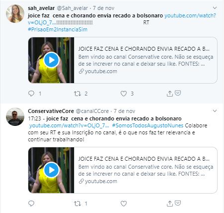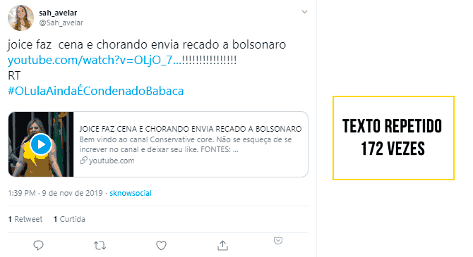 Além da alta frequência, as publicações com a tag começavam com um número que corresponde a um horário, três horas adiantado em relação ao de Brasília, e com a palavra “urgente”. Também acompanhavam um link para o canal “Conservative Core” no YouTube.Muitas vezes o próprio texto das postagens era idêntico. Sah Avelar publicou 172 vezes o texto “urgente – joice faz cena e chorando envia recado a bolsonaro”, levando ao vídeo de mesmo título no canal Conservative Core. Outros 30 textos foram tuitados mais de 100 vezes, com diferentes hashtags, representando 36% do total de publicações feitas pelo perfil no período.