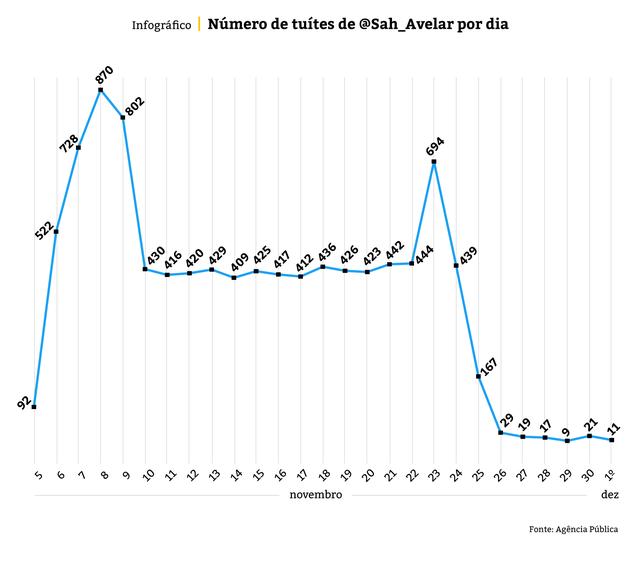 Esse passou a ser, então, o padrão de publicação do perfil @Sah_Avelar. Do dia 5 de novembro ao dia 1o de dezembro de 2019, período monitorado pela reportagem, a conta publicou 9.949 tuítes. Uma média de 368 publicações por dia. Quinze tuítes por hora. Um a cada 4 minutos.