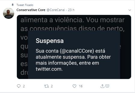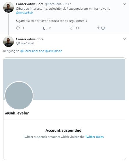 Três dias depois da reportagem entrar em contato com a plataforma – pela segunda vez – o perfil @Sah_Avelar e o @CanalCCore foram suspensos. Imediatamente após a exclusão, foram criadas contas alternativas. O @CanalCCore virou @CoreCanal e @Sah_Avelar virou @AvelarSah. Os perfis denunciaram as suspensões, reclamando terem perdido seguidores.