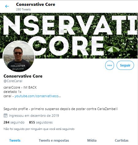 O novo @CoreCanal se apresenta na descrição com a frase “I’m back”, ou “estou de volta” em tradução livre. Com um dia de atividade o perfil já tinha feito 284 publicações e acumulava 855 seguidores. A Pública entrou em contato com o responsável pelos perfis, que também administra o canal Conservative Core. Identificado como Caio Giovanetti, ele admitiu fazer uso de automação nas contas. “As hashtags são automáticas utilizando a mais utilizada entre os usuários que eu sigo”, disse. Giovanetti, no entanto, afirma que a “a automação usada é lícita”, apesar de ter tido contas suspensas.