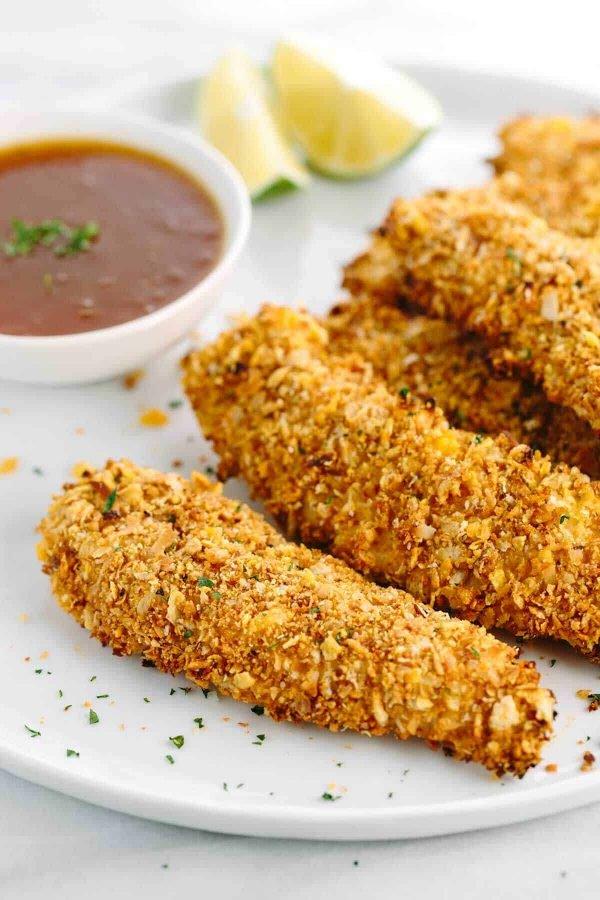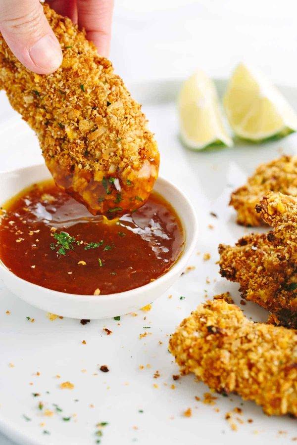 My little one James has become quite the picky eater lately. I do my best to make the most wholesome meals for my family, but sometimes it can be a struggle. I feel like chicken tenders always get a bad rap, but kids LOVE them! After some serious chicken finger testing, I’ve conjured up something delicious in the test kitchen just for you. The trick is the crispy cereal coating, with a Thai-inspired mixture of coconut and lime. I’ve even paired it with an easy to make orange dipping sauce. Each bite will be so delicious!