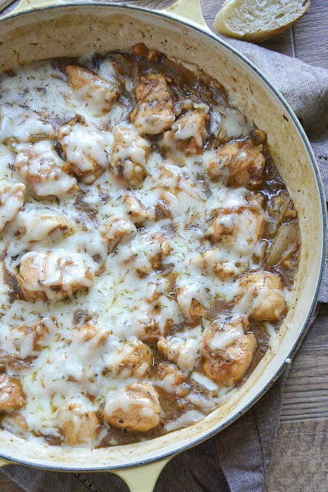 This French Onion Chicken has all the flavors of French Onion Soup combined into a yummy family-friendly skillet meal. My favorite way to serve this is over thick slices of french bread, egg noodles or rice. Instead of a soupy dish, I created a french onion gravy which really gives this dish that classic flavor. It’s topped with lots of shredded Swiss cheese and baked in the oven for a few minutes until the cheese is melted.