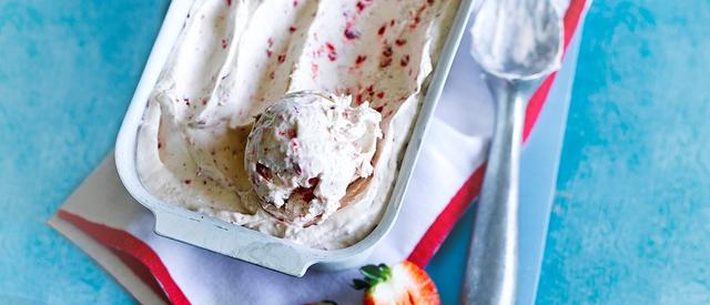 Meanwhile, put the double cream and condensed milk into a large mixing bowl. Using an electric whisk, beat them together until the mixture is thick and can hold peaks. Use a spatula to push any remaining purée through the sieve, then gently fold it through the creamy mixture. Sprinkle over the freeze-dried strawberries and fold these in too, then scrape into a freezer-proof container and freeze until solid. Serve in cones or bowls with your favourite toppings.