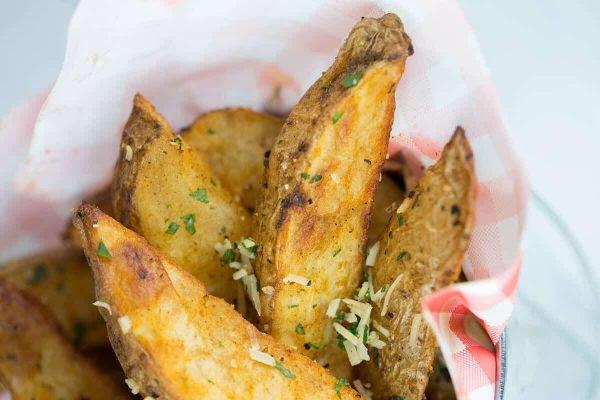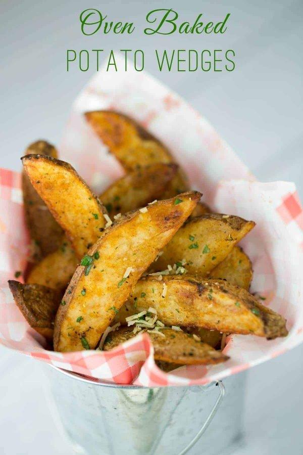 Crisp oven-baked potato wedges are a healthier delicious side dish, tossed in parmesan cheese and parsley. Dip each wedge in creamy sour cream chive sauce.