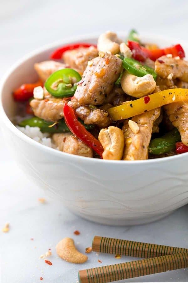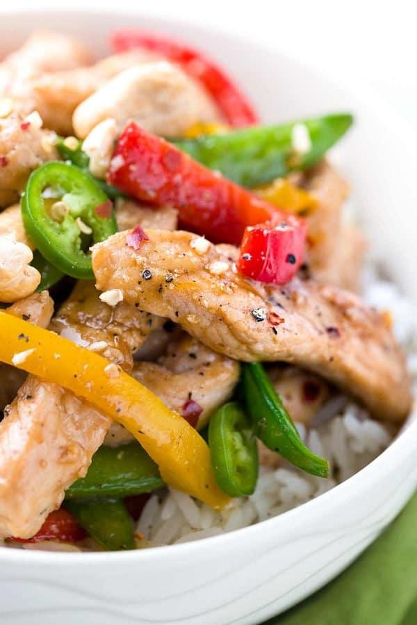 Transfer stir-fry to a serving bowl. Sprinkle with cashews and serve with rice.
