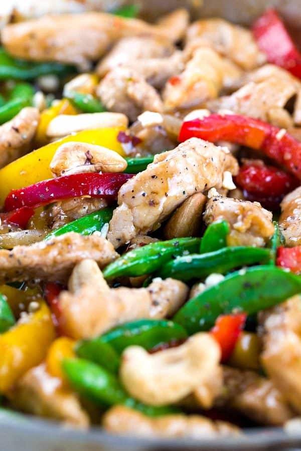 Try this easy pork stir-fry with sugar snap peas and cashews for a delicious Asian inspired meal. The meat is tossed with a savory soy and honey sauce.