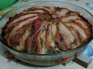 - Em uma forma untada coloque o bolo e, por cima deste, as fatias de bacon