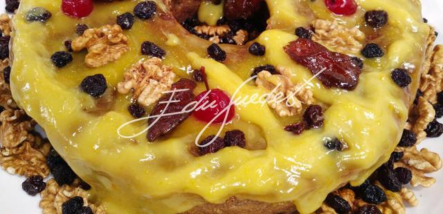 Montagem: cubra o bolo com a baba de moça. Decore com nozes, uvas passas, maçãs, cerejas. Polvilhe o açúcar de confeiteiro.