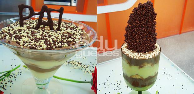 Montagem: se a travessa for alta, faça camadas, alternando os cremes e a bolacha molhada no chocolate ou no café. Termine com um dos cremes e coloque o enfeite.