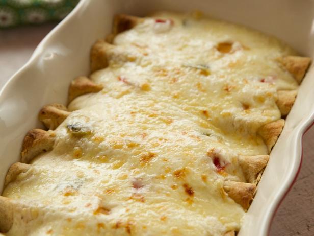 Place a small amount of the chicken mixture and about a tablespoon of the grated cheese down the center of each tortilla. Fold over the edges and arrange them seam-side down in a 9-by-13-inch baking dish. Pour the sauce over the top. Sprinkle the top with the remaining 1 cup grated cheese and bake until bubbly, 20 to 25 minutes.