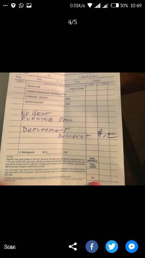 The bill was only $1. However, when I went to give him that, he replied that it was only a joke and I should thank my husband on his behalf for his service to the country.