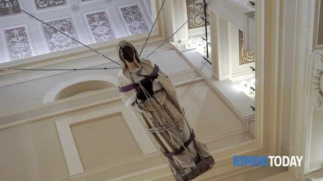 “Anni fa, rottamata tra le macerie di una demolizione, ho raccolto una vecchia statua di Madonna – scrive D’Augusta - gravemente danneggiata dal tempo, dall’incuria, forse dalla guerra evidentemente era stata ritenuta ormai inutile, inadeguata alle funzioni della liturgia, incapace di miracoli, non più degna di devozione, priva dei doverosi decori rosa e azzurri, priva anche di quella “grazia” di cui tutte le Madonne sono portatrici. Eppure quella Madonna sgangherata, nelle vistose crepe nel legno e nel gesso, sembrava riassumere le ferite di una umanità sofferente, e, nella dignità di simbolo, si caricava di poetica espressività e di una diversa, più profonda, bellezza. Sarà che noi riminesi abbiamo l’ombra di Fellini alle spalle, ma mi è sembrato che quella Madonna a fine corsa, buttata via, ridotta a cianfrusaglia di misero modernariato, avesse qualcosa in comune con la tenerezza, visionaria e laica, umanamente “religiosa” e pura, delle gelsomine felliniane. E poi c’è il Cristo appeso all’elicottero, memorabile incipit de “La dolce vita”, che sorvola i tetti e le terrazze di una Roma distratta e distante. Allora ho pensato che quella Madonna dovevo appenderla, in alto, e che fosse incombente e protettiva, anche minacciosa, e che fosse come una preghiera contro tutte le guerre: un Ex voto “Per Grazie Non Ricevute”. E così l’abbiamo appesa dentro il Teatro Galli (ma quale migliore sede?), austero e imponente come una cattedrale dell’orgoglio e della memoria riminese. La Madonna rottamata oscilla appena appena, e ascolta la musica”.