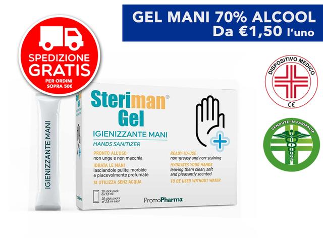 Questo gel igienizzante per le mani con il 70% di alcool si presenta in una comodissima confezione da 20 pratiche bustine monouso (2,8 ml ognuna). Steriman gel è un igienizzante e antibatterico ad uso frequente per le mani, con proprietà antimicrobiche in grado di uccidere germi e batteri in maniera rapida. Non richiede risciacquo, non unge, non macchia ed è a rapido assorbimento; inoltre, è in grado di idratare la pelle lasciando le mani pulite, morbide e piacevolmente profumate.