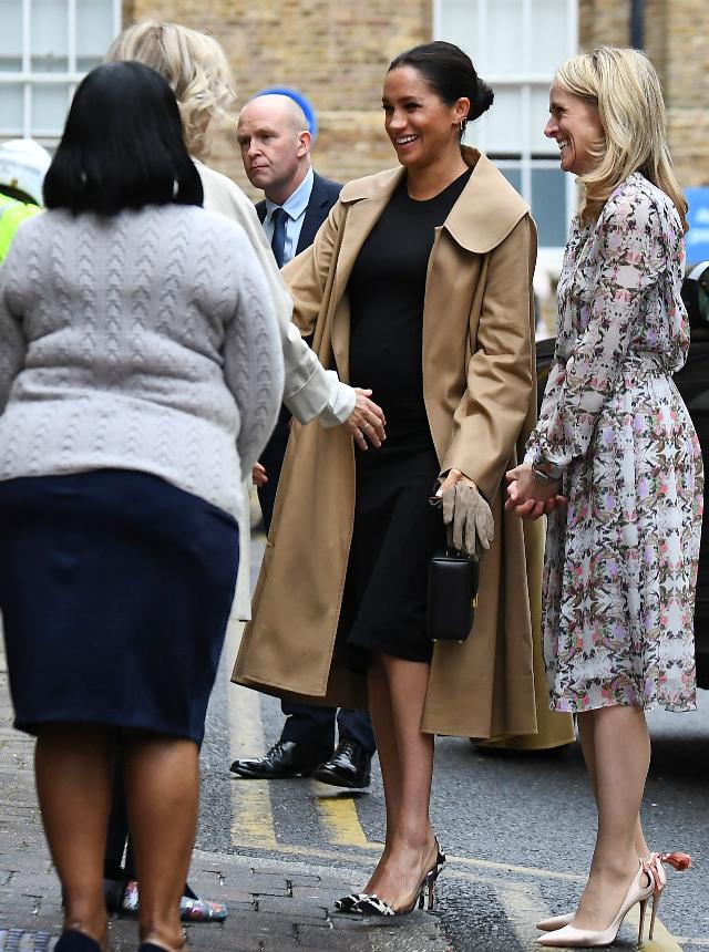Para la ocasión, Meghan Markle lució un look clásico: vestido negro con abrigo color arena firmado por Oscar de la Renta. Como accesorio lleva aretes Kimai.