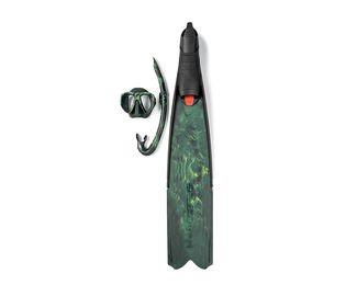 Freediving fin, mask and snorkel combo in matching camouflage for extreme stealth. These long-blade fins and matching mask and snorkel ensure stealth for spearfishing. The Motus Camo fin has an interchangeable blade and is built to be flexible and responsive with a foot-pocket made with of two materials with different densities for enhanced comfort and performance. The Jet snorkel is anatomically designed and the One mask has a reduced internal volume with frame-integrated buckles.