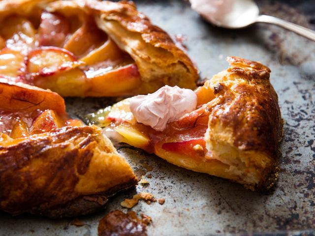 A galette, or freeform pie, is the perfect vehicle for fruit like peaches, which won't survive the long bake at high heat that's needed for a traditional pie made in a pie dish. It's also perfect for when you don't want to bother with careful shaping and fluting of that crust, since all you've got to do is pile the filling in the middle and fold the dough over, section by section. You can substitute other stone fruit for the peaches, or swap out some of it for berries.