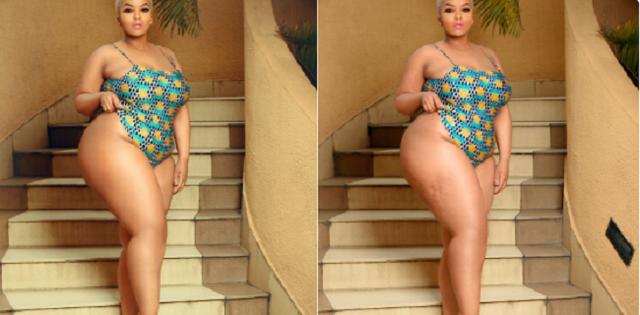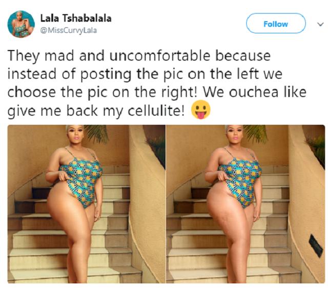 Lala Tshabalala shared a swimwear image of herself without having the cellulite on her thighs photo-shopped out of it.