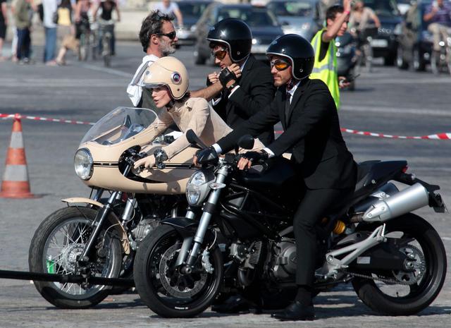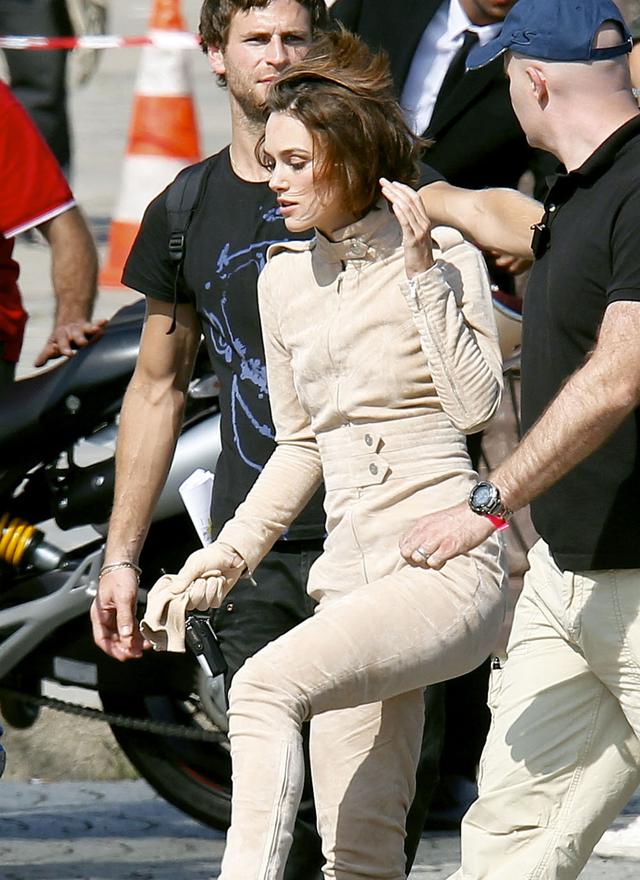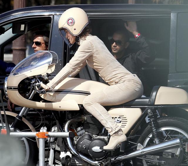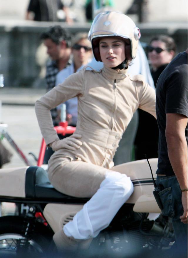 Keira Knightley looking ridiculously hot in a fancy shmancy jumpsuit while riding a motorcycle