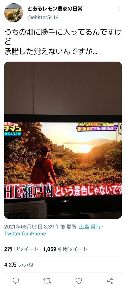 番組では無人島・尾久比島を探索する様子や、その際にたどり着いたレモン畑でレモンを収穫し、食べる様子などが放送されました。番組では「地権者の許可を得て放送しています」というテロップが入っていたものの、放送後にレモン畑の地主である人物がSNSに「うちの畑に勝手に入ってるんですけど。承諾した覚えないんですが…」と投稿。このことから、視聴者からも批判が殺到し《セシタマン見てて無人島と言いつつ、なんか変な感じはしてたんだけどまさか無許可とは…。》《え!?めちゃくちゃなんか無人島扱いされてレモン食ってたよセシタマン。無許可なん!? え?まじで無許可?!》《冒険少年無許可で畑入ったならヤバくない?》《アイアム冒険少年、レモンとか勝手に使っていいんかいて思いながら見てたけど、案の定無許可か》などの厳しい声が集まってしまったようです。